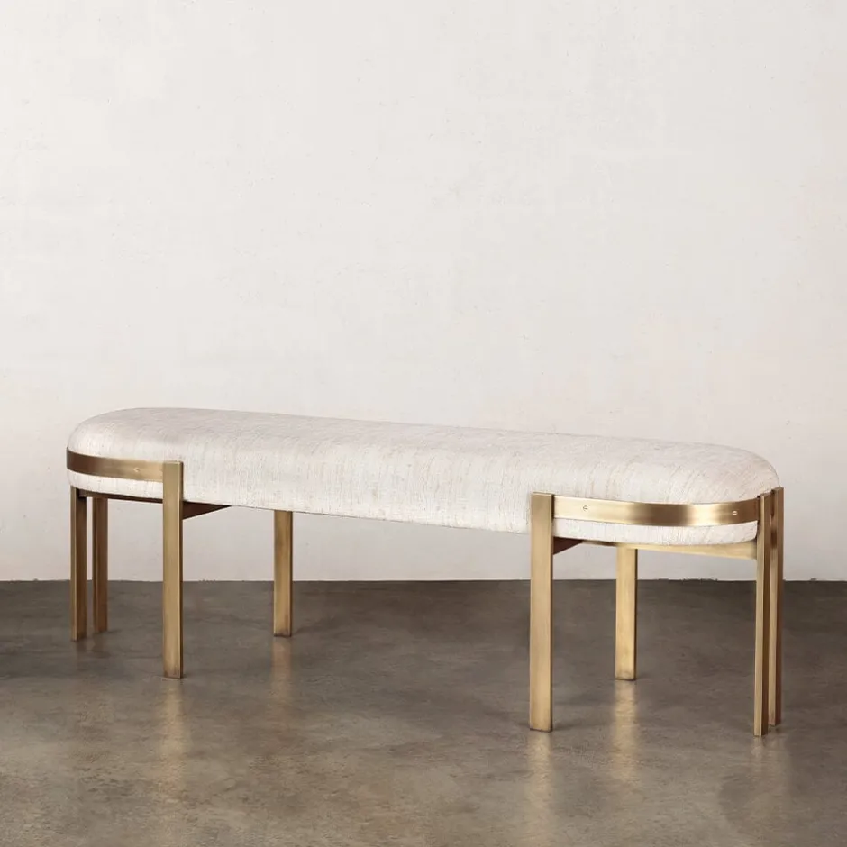 The iconic Elliot Bench combines clean lines with classic vernacular. This upholstered bench features paired brass bar-stock legs finished in either a Burnished Brass or Oil Rubbed Brass finish. The seat is available in a selection of curated fabrics and leathers. Hand crafted in Los Angeles.