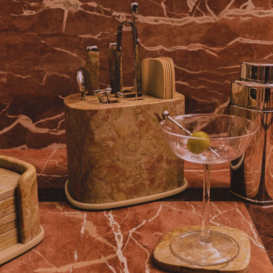 The Maris Marble Accessory Set brings both style and function to your space, with a marble structure featuring sandblasted aluminum accents and stainless bar accessories.