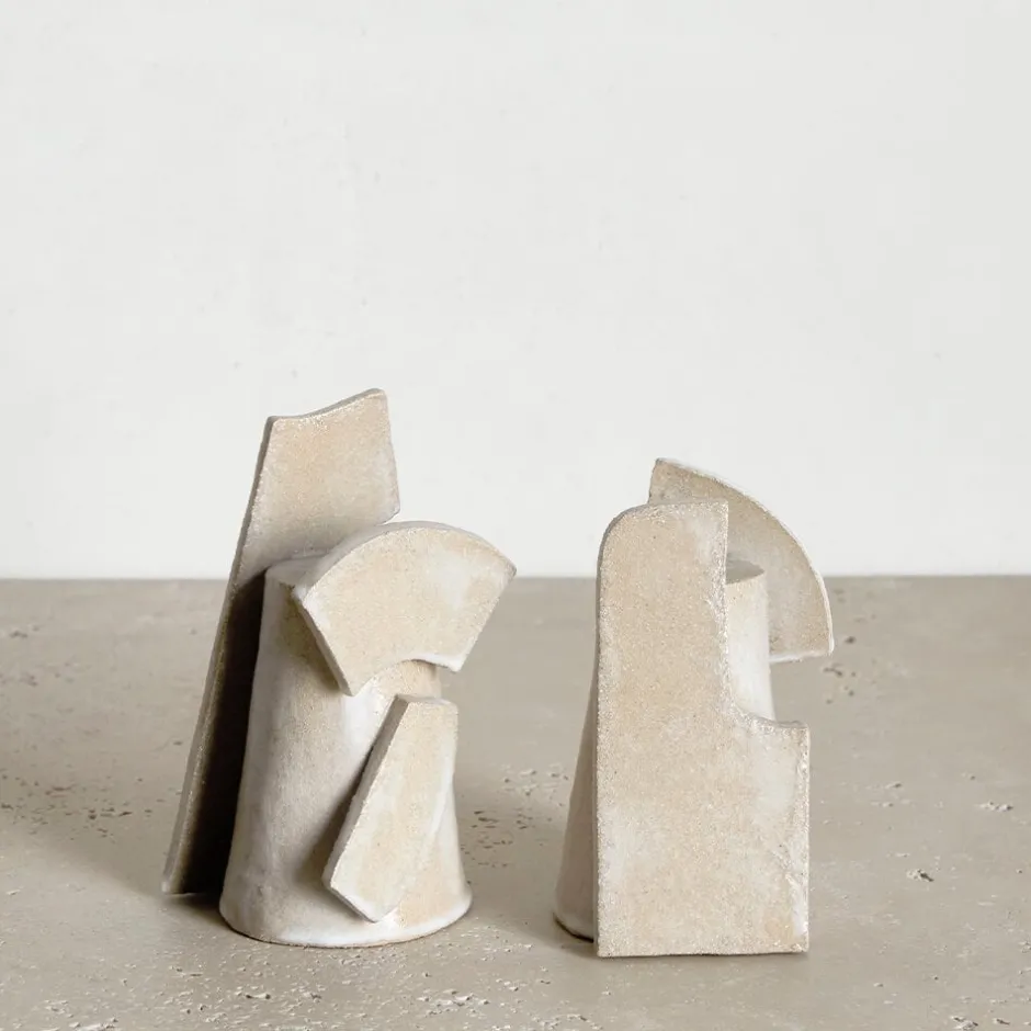 Handcrafted in Los Angeles, convex shapes combined with natural materials hand-glazed in Smokey Plum and Frosted Flax reveal subtle nuances that make each Shape Candle Holders truly unique.