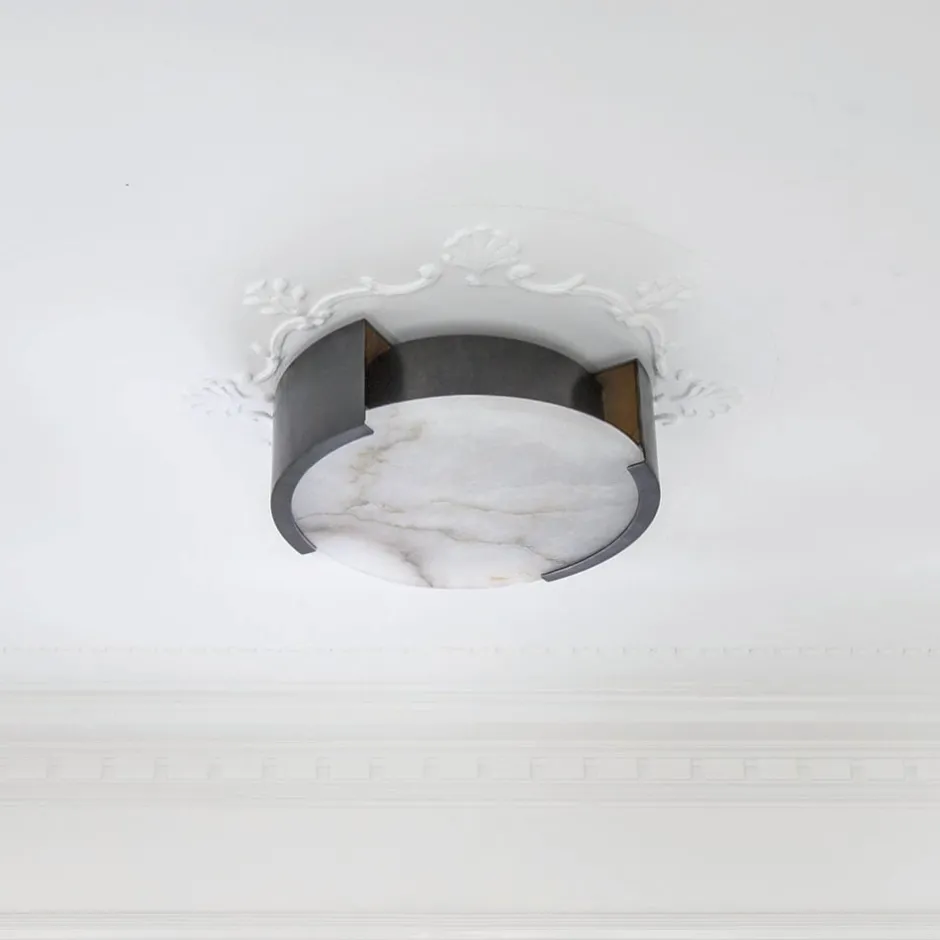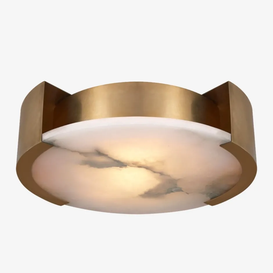 Effortlessly pairing natural alabaster and sleek metal detailing in a streamlined geometric form, the Melange Large Flush Mount exudes a modern refinement while emphasizing the beauty of natural stone. This fixture features hand-carved natural alabaster with either Burnished Brass, Bronze or Polished Nickel detailing and is rated for damp locations.
