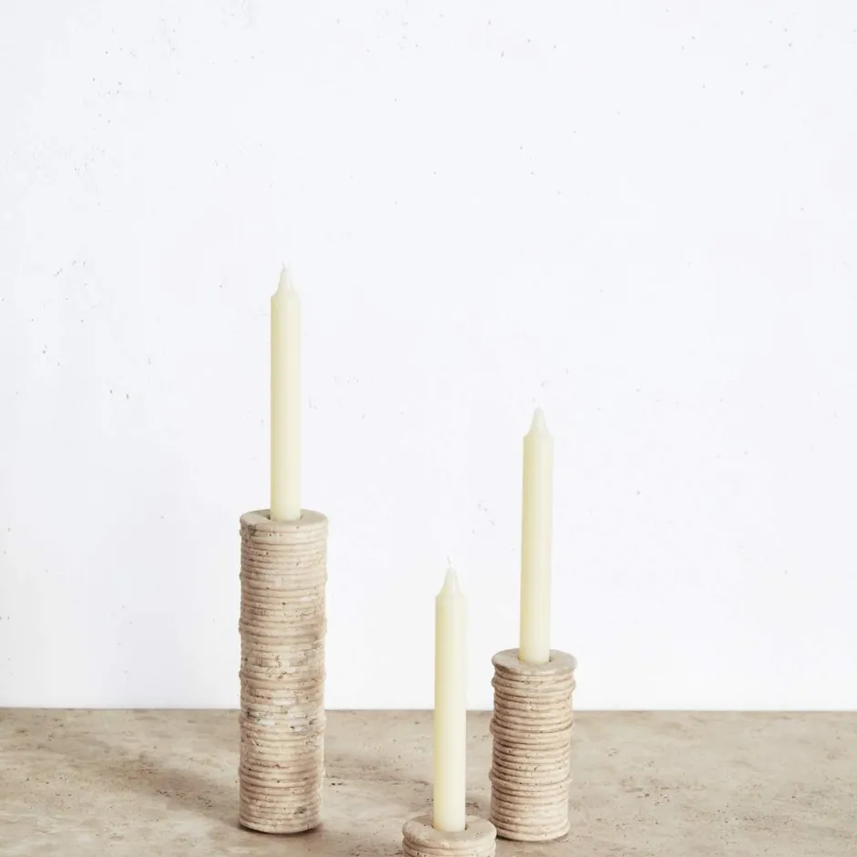 A reflection of nature’s influence, the Ribbed Small Candle Holder features a monolithic aesthetic with intricate ribbed detailing crafted from natural travertine stone.