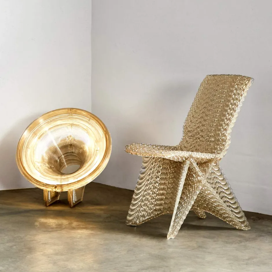 Dutch artist Dirk van der Kooij produces one-of-a-kind functional art through playful extrusion of unlikely materials. Among his critically acclaimed works, the pioneering “Endless Chair” won acclaim in 2011 as the first furniture design constructed by low-resolution 3D printing. Hinging on a formal exploration of 3D printing as a rapid prototyping process, Kooij designs capture the beauty found in reclaimed materials.