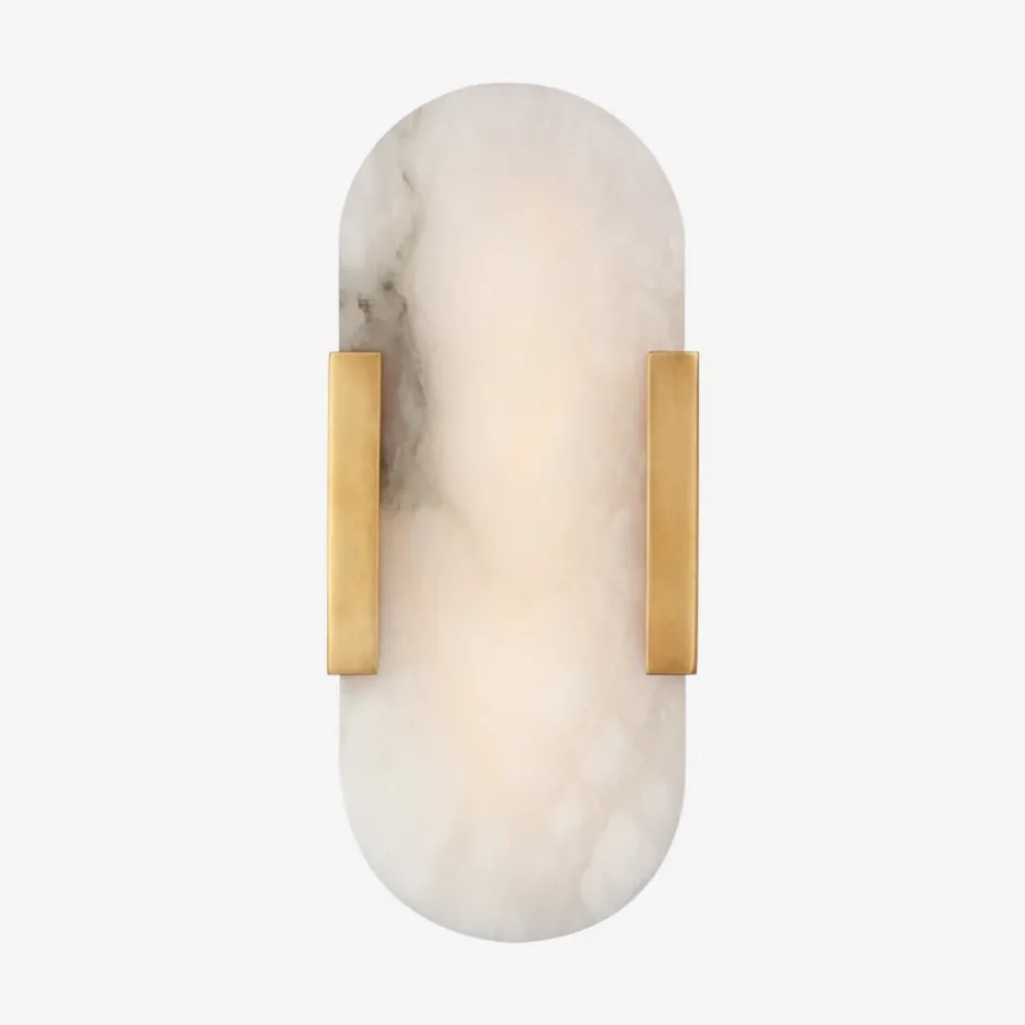 Effortlessly pairing natural alabaster and sleek metal detailing in a streamlined geometric form, the Melange Elongated Sconce exudes a modern refinement while emphasizing the beauty of natural stone. This fixture features hand-carved natural alabaster with either Burnished Brass, Bronze or Polished Nickel detailing and is rated for damp locations.
