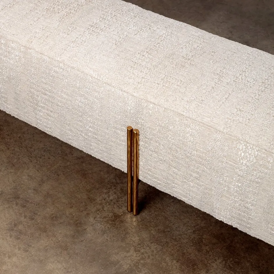 With a form that is both simple and bold, the Melange Bench is the paradigm in nuanced modern design. This bench features solid cast brass legs with an artisanal hand that’s been finished in a lightly polished burnished brass patina. The upholstered seat is available in a selection of curated fabrics and leathers. Hand crafted in our Los Angeles workshop.