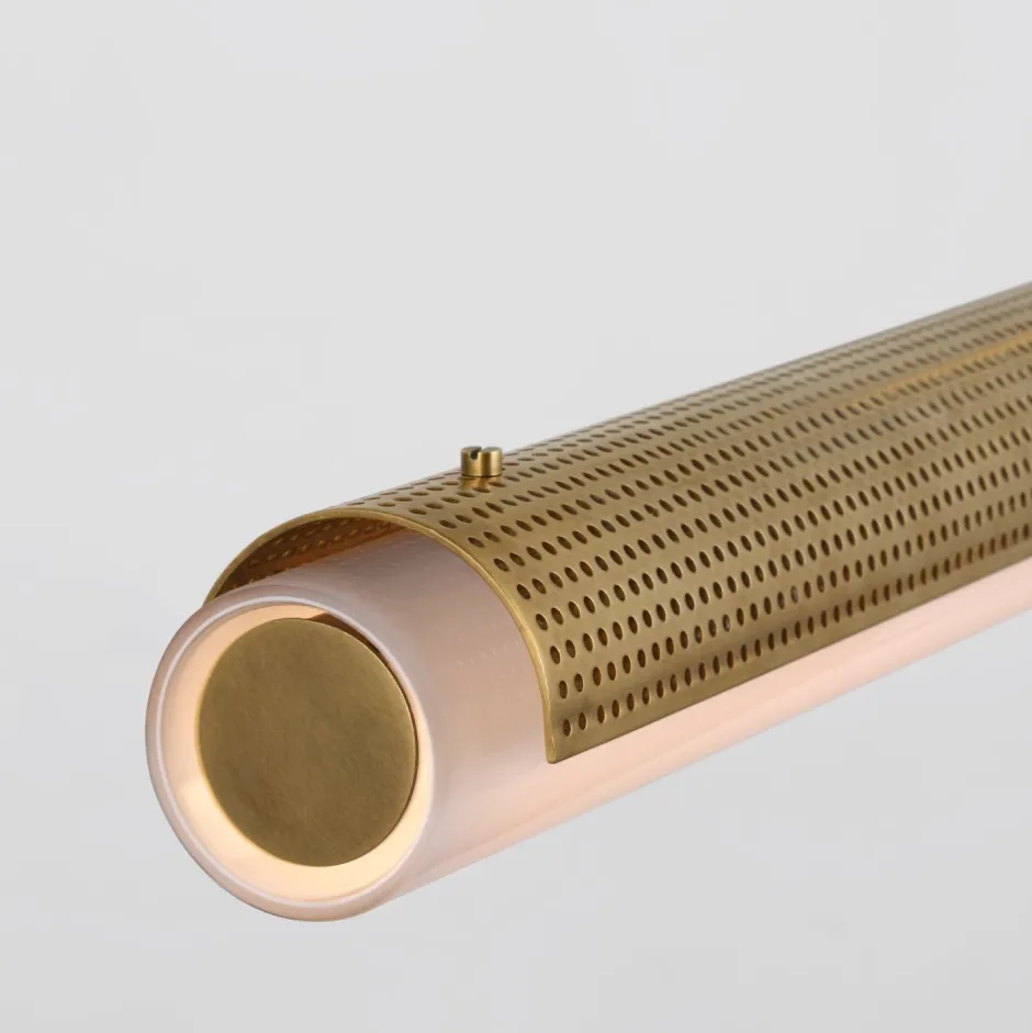 Featuring perforated metal and a sculptural form, the Precision collection is born out of a love of architecture, and the interplay of light over form. The perforations, a signature design element within our studio, diffuse and reflect light to add a delicate texture and rich sense of depth to any space. Available in Antique-Burnished Brass, Bronze, and Polished Nickel with White Glass.