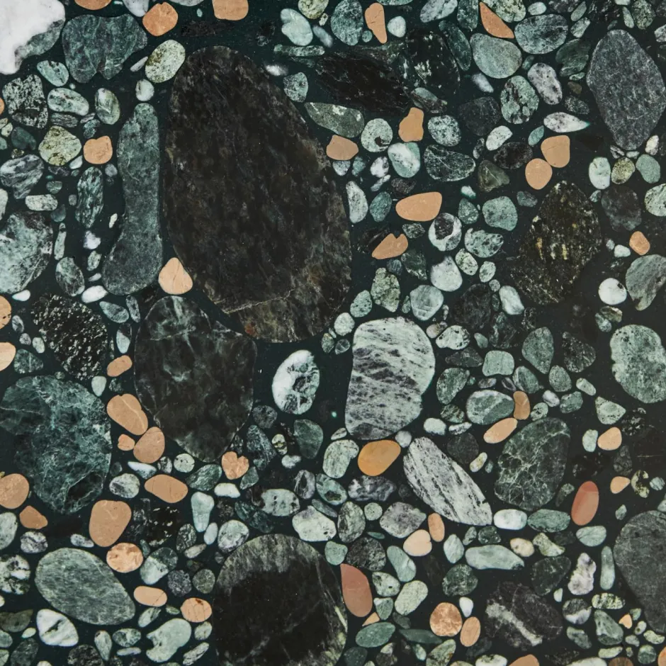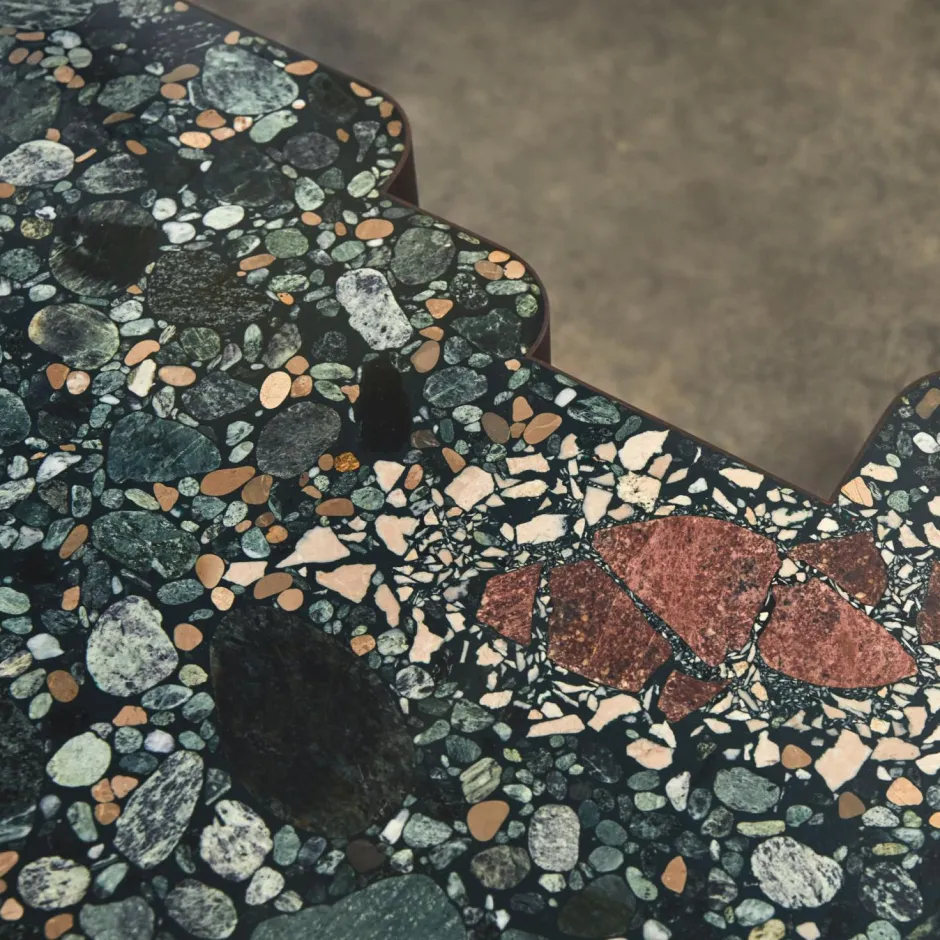 An amalgam of superlative materials, the Xenolith Console emphasizes the inherent beauty of disparate elements with its handcrafted bricolage surface comprised of Terrazzo stone supported by an elegant oxidized iron frame. Due to the intrinsic nature of natural material, each design is one-of-a-kind and can be featured alone as furniture sculpture or part of the collection.